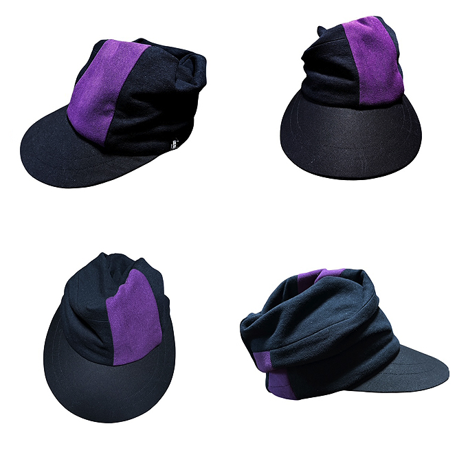 CP-260105 Brim Spiral Hairband COL:BLK/PUP SIZE:57cm~60cm MTL:TOP/Cotton100% パーツ:ブリムポリ芯、シルリード+平ゴム All handmade in Tokyo Japan 持ち込まれたサンバイザーをアレンジした、ツバ付きスパイラル・へアバンドです。 綺麗に決まりましたね!