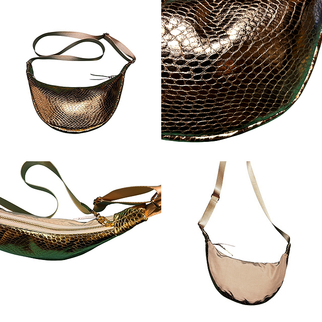 BG-250674 HALF MOON BAG COL:ASST SIZE:幅:30cm、高さ:14cm、マチ:3cm、ショルダーベルトMAX110cm MTL:天然皮革、背面:60%コットン/40%ナイロン パーツ:ベルト、サテンナイロン、ファスナー/YKK(日本製) ¥18,700(TAXin) All handmade in Tokyo Japan